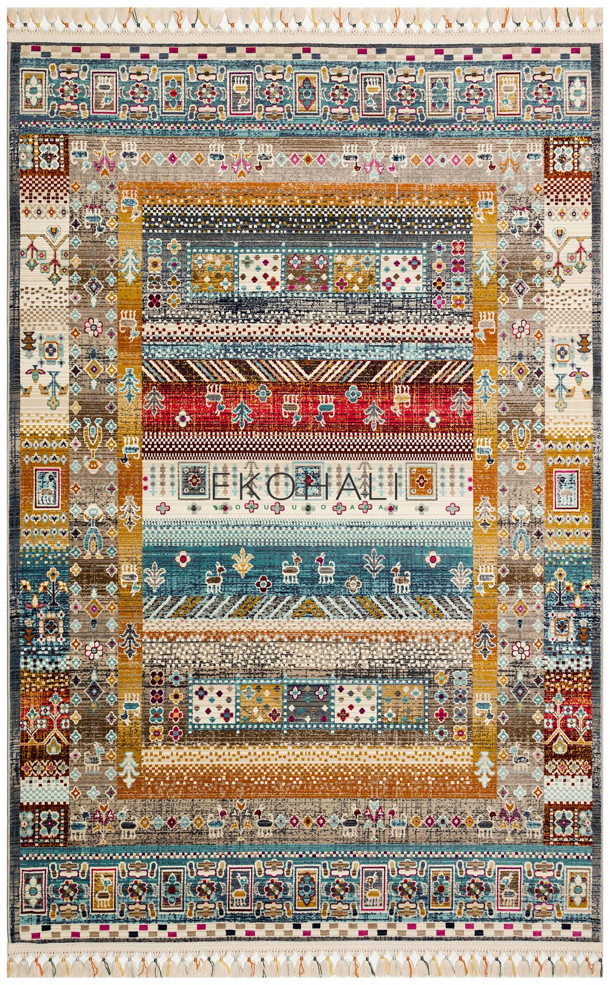 Modern desenleri etnik detaylarla buluşturan renkli makine halısı